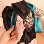 Diadema en tela satinada en forma de Lazo con boton en piedras brillosas